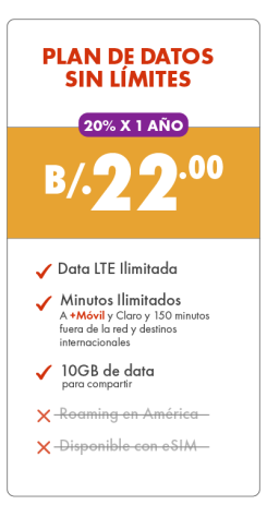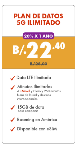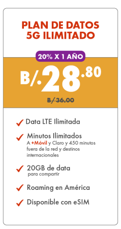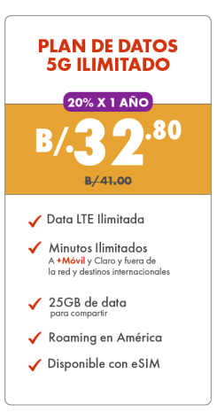 Promoción válida del 01 al 28 de febrero de 2025. Al realizar tu portabilidad numérica a +Móvil con el Plan Postpago 5G YA desde precio regular de B/.28 mensual, recibe un 20% de descuento durante los primeros doce (12) meses de servicio sobre el precio del plan regular contratado; a partir del mes trece (13) adoptará su precio regular. Contrato mínimo de 18 meses en aviones Postpago. Los precios no incluyen impuestos aplicables. Conectividad 5G sujeta a cobertura y equipo compatible con esta tecnología, inicialmente en determinadas zonas en Ciudad de Panamá, que irá expandiéndose de manera progresiva. Aplicación Política de Uso Justo Postpago (Planes Postpago y Roaming https://cw.pa/america ). No aplica descuento adicional sobre el precio de promoción. Abono y pagos en cuotas sujetos a política y evaluación crediticia. Para mayor información en aviones y condiciones, ingresa a 5G Ya.